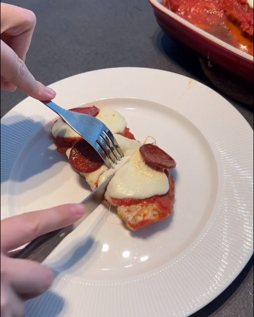 - Start med å skjære kyllingfileten på midten for å lage litt tynnere skiver. Legg i en ildfast form og hell over litt olje. Smør deretter filetene i oljen og krydder. Hell over tomatsaus og topp filetene med skivet mozzarella og pepperoni.